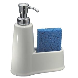 Made of high-gloss ceramic and rust-free stainless steel, this kitchen soap pump provides an array of convenient features. The unit not only dispenses soap from the soap pump, but it also provides a built-in scrubby holder, keeping both the soap and the scrubby together and easily accessible. It offers a 25-ounce capacity and works great in small kitchens, helping to reduce clutter that can form next to the sink like oversized bottles of dish soap and scrub brushes left lying around.